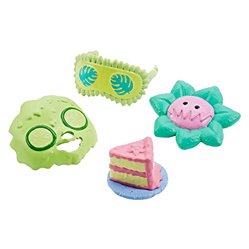 Gli accessori preistorici per questa occasione includono un cuscino floreale, una fetta di torta e un'adorabile mascherina di cetrioli che la bambola Fernessa può indossare.