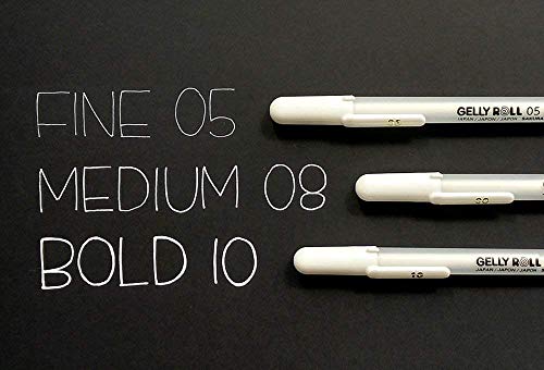 Sakura Gelly Roll.Punte sottili (0,5 mm), medie (0,8 mm) e unte (1,0 mm) Inchiostro bianco opaco da utilizzare su superfici scure o per aggiungere riflessi Fornisce un flusso costante di inchiostro fino all'ultimo tratto