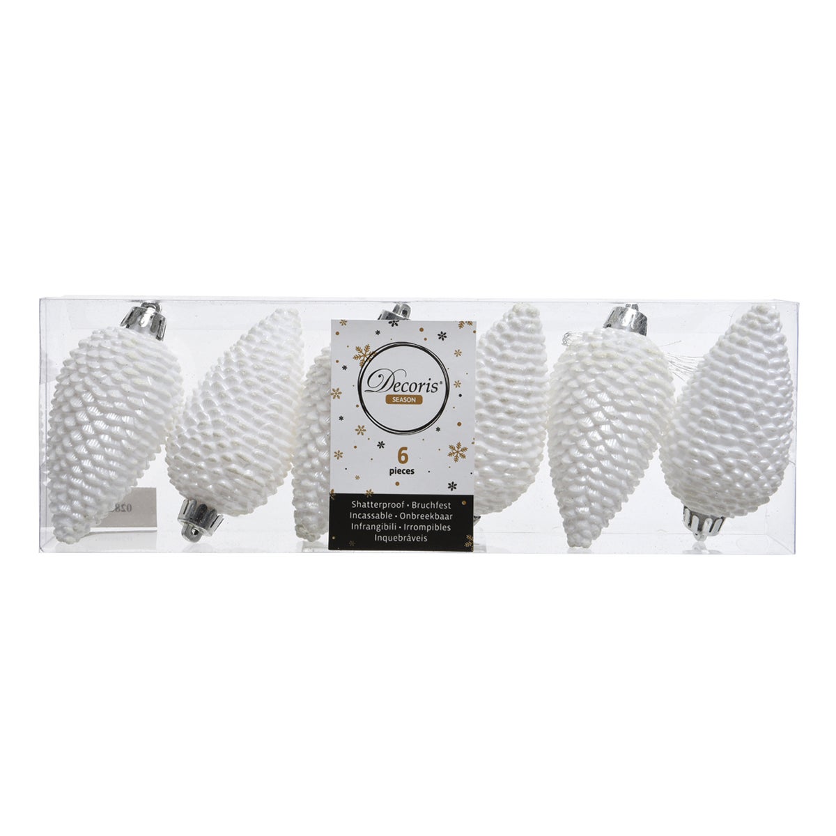 Box 6 pigne di Natale Artic in plastica di colore bianco.