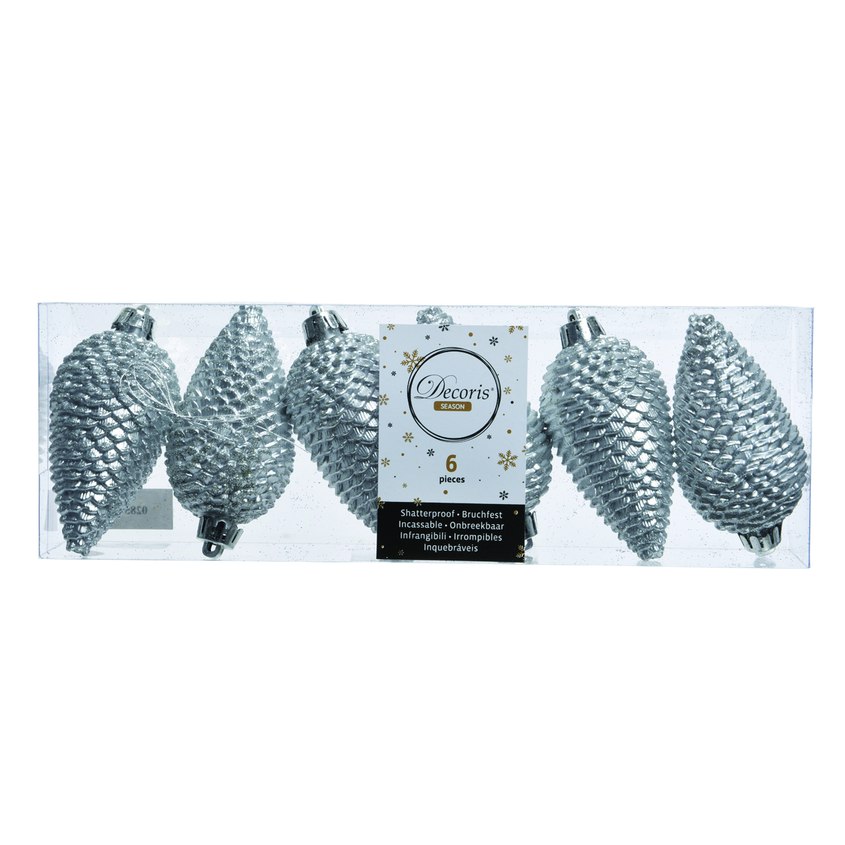 Box 6 pigne di Natale Artic in plastica di colore grigio / argento.