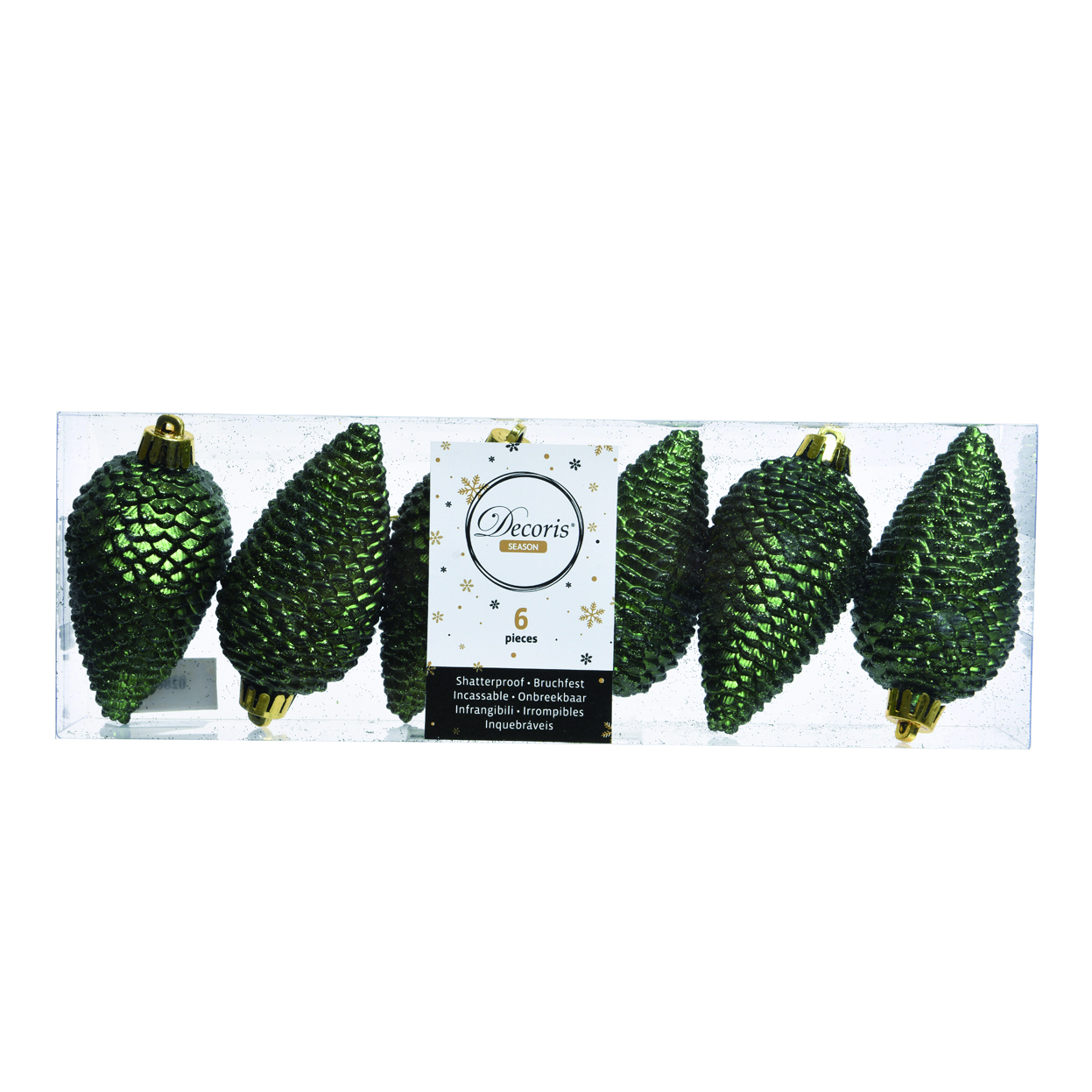 Box 6 pigne di Natale Traditional in plastica di colore verde.