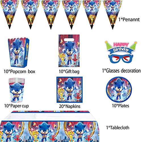 PiliStar 59 Pezzi Forniture per Feste a Tema Sonic,Set Festa di Compleanno di Sonic con Piatti Carta, Bicchiere di Carta, Tovaglie, Borsa Regalo, Bandierine per 10 Bambini e Bambine