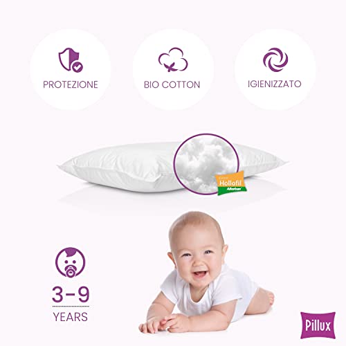 Pillux Cuscino per Bambino 3-9 Anni - Antiacaro e Antiodore - Utilizzo specifico per Allergie - con Fibra certificata Hollofil Allerban con Antiacaro attivo - Rivestimento Sanitized - Made in Italy