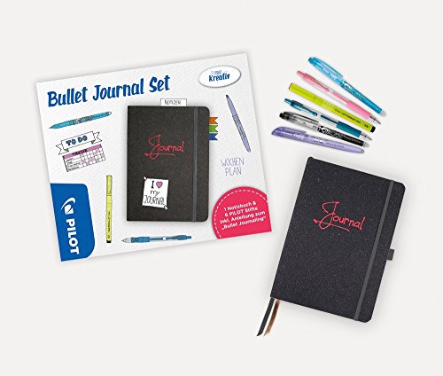 Set di sei penne Pilot, istruzioni su 16 pagine e diario Bullet: disponibile in 2 varianti di design, formato A5, copertina rigida con angoli arrotondati, 192 pagine, rigatura a puntini, carta di alta qualità (90 g/mq) in bianco trasparente, con 2 segnalibri in colore coordinato, tasca interna con elastico, passante per penna.