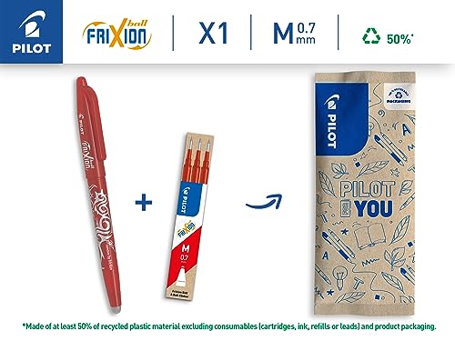 Pilot, Penna Cancellabile Frixion Ball + 1 Set da 3 Ricariche, Penna Cancellabile Frixion Ball con Gommino Integrato, Punta Media, Colore Rosso