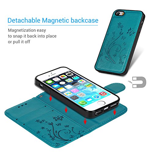 Pincenti Custodia iPhone SE, iPhone 5S Cover Pelle Premium PU e Silicone TPU Case [2 in 1, Separato] - Flip Cover Morbido Leather,Goffratura Farfalla e Fiore, Chiusura Magnetica, Supporto Stand - Blu