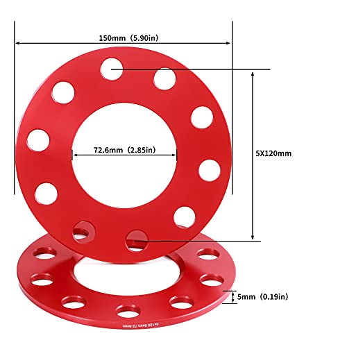Pindex Distanziali Alluminio 5 mm, 2 Pezzi Distanziali per Ruote Auto 5 x 120 mm, Foro Centrale 72,6 mm, con Bulloneria (M12 x 1,5)