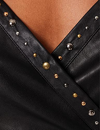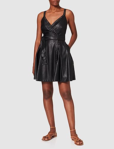 Abito senza maniche in tessuto finta pelle con spalline sottili che incrociano sul retro, decoro con borchie e gonna dal volume leggermente ampio. Completo di cintura a fusciacca in tessuto abbinato da annodare in vita.