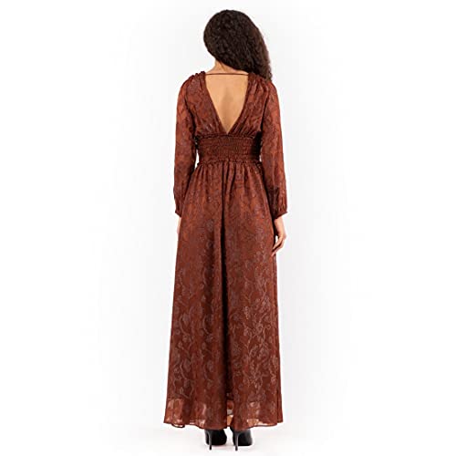 Abito lungo con ricamo fil coupè lurex con profondo scollo a V sia davanti che sul retro, maniche lunghe dal volume fluido e dettaglio di punto smock elastico in vita.