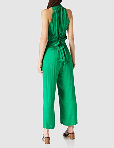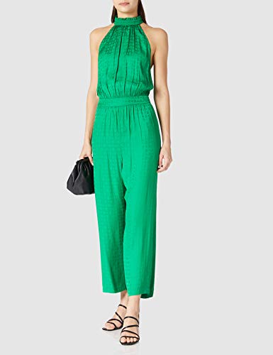Tuta lunga senza maniche in viscosa jacquard con disegno geometrico. Scollo all'americana allacciato sul collo e fascia effetto cintura in vita.