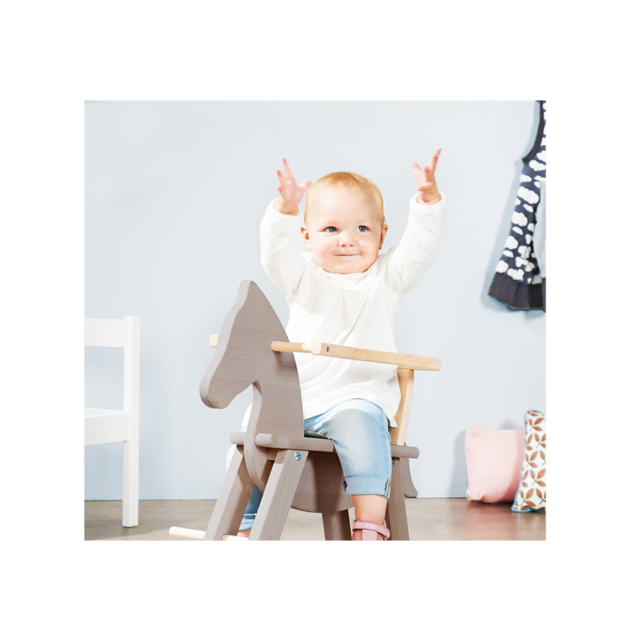 Un classico che diverte i bambini di tutte le generazioni! Sicuro grazie all'anello di protezione in faggio massiccio. Quando il bambino cresce, l'anello si può rimuovere. Un classico dallo stile senza tempo, grazie al contrasto grigio/legno. Dettagli: In legno massiccio: Faggio Dimensioni: 86 x 31 x 58 cm Altezza sedile: 34 cm Anello di protezione removibile Ideale da 9 mesi fino all'età di 4 anni Attenzione Da usare sotto la sorveglianza di un adulto! Usare solo in luoghi privati.