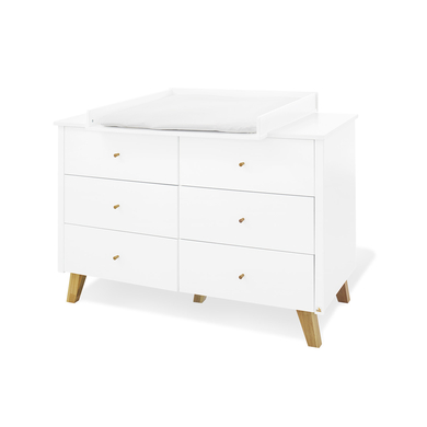 Pinolino sviluppa e realizza dal 1997 un'ampia gamma di mobili per bambini, accessori e giocattoli. Vasta gamma di assortimento nei tre stabilimenti. La combinazione vincente degli articoli, il buon servizio assistenza clienti ed i prezzi convenienti fanno di Pinolino il giusto Partner. L'ambizioso obiettivo della società è quello di ottenere la massima soddisfazione a tutti i livelli. Materiale di alta qualità, precisione e la passione nei dettagli rendono Pinolino uno specialista nei mobili. Look moderno-retrò Pan rivive i vecchi tempi. La combinazione di ante bianche, piedi in legno e i piccoli pomelli donano alla cameretta un look moderno, ma al tempo stesso retrò. Perfetta per gli amanti di questo stile. Dettagli del prodotto: Colore: bianco Materiale: MDF laccato Materiale piedi e pomelli: Legno massiccio di quercia Dimensioni: Ampiezza x Lunghezza x Altezza 140 x 78 x 100 cm Altezza fasciatoio: 92 cm 6 cassetti con funzione Self-Soft-Close La base fasciatoio può essere montata a destra o a sinistra indistintamente. Base fasciatoio removibile Incluso nella confezione: Mobile fasciatoio Base per il cambio Attenzione: Materassino e decorazioni NON sono inclusi nella spedizione!