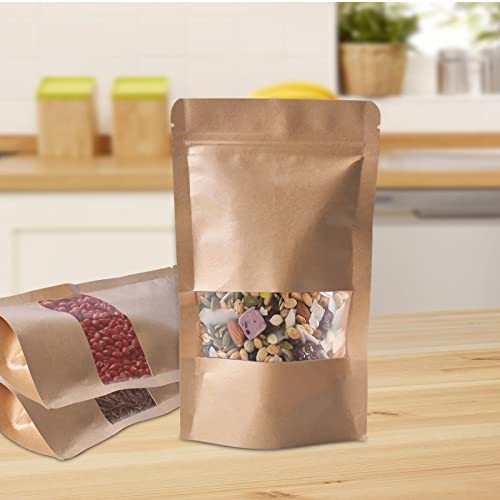 Pinsheng Sacchetti di Carta Kraft con Finestra 100 Pezzi, Buste Carta Alimenti Sacchetto Carta Kraft Autosigillante con Chiusura a Zip per Frutta Secca Biscotti Caramelle e Caffè in Grani (L)