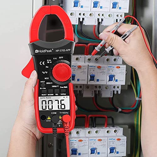 Pinza Amperometrica AC/DC 0-1000A, Pinza Multimetro HoldPeak 570S con Bluetooth, Amperometro Digitale 6000 Conteggi Autoranging, NCV Volt ohm Resistenza Capacità Continuità Temperatura Diodo(Rosso)