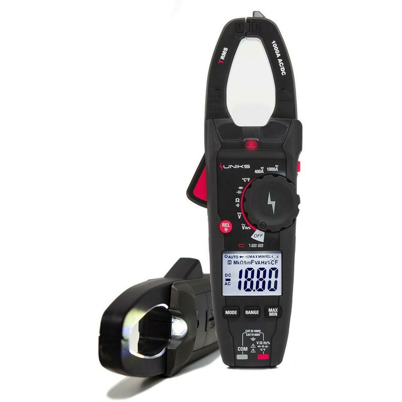 PINZA CORRENTE AC/DC 1000A TENSION PINZA AMPEROMETRICA TRMS, AC/DC 1000A, CAT IV 600V, CAT III 1000V La pinza amperometrica Uniks C122 e' pensata per l'utilizzo in ambiti industriali. Effettua misure in TRMS di tensione fino a 1000V e corrente fino a 1000A AC/DC, misure di frequenza, capacita', prova diodi, continuita' e resistenza. Il design moderno, le meccaniche fluide e precise sia per l'apertura del toroide che per il commutatore facilitano il lavoro in campo. E' dotata di un rilevatore di tensione incorporato che si accende se posto in prossimita' di conduttori attivi e di una torcia integrata che permette di lavorare anche in luoghi molto bui. Uniks C122 esegue le seguenti misure: tensione DC e AC TRMS fino a 1000V corrente AC TRMS fino a 1000A corrente DC TRMS fino a 1000A resistenza e test di continuita' con cicalino capacita' e frequenza con puntali e con toroide duty cycle (Ciclo di lavoro) prova diodi Normative di riferimento MC & LVD EN: 61326 EN: 61010-1 EN: 61010-02-032