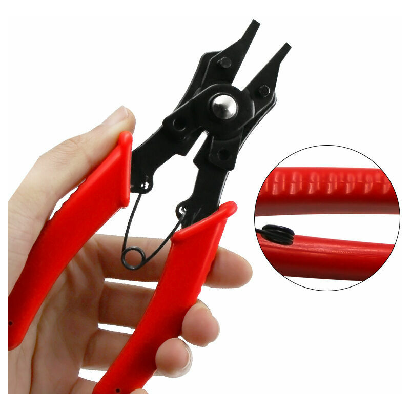 Specifiche delle pinze per anelli elastici quattro in uno: 5 pollici Modello: pinze per anelli elastici quattro in uno Imballaggio: confezione di cartone Made made in acciaio ad alto tenore di carbonio La superficie del corpo della pinza è annerita, antiruggine e anticorrosione 3 pinze di ricambio, gamma di utilizzo 10-15 mm Per albero, per foro, per multifunzione, Testa di serraggio con design antiscivolo dentato Dimensioni confezione: 241x109 mm