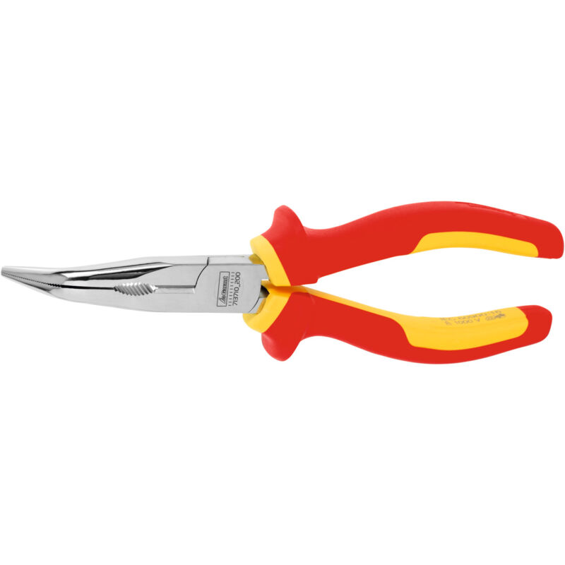 Becchi particolarmente lunghi, mezzotondi a punta. Taglienti temprati a induzione (circa 61 HRC), adatti per filo duro e dolce. Becchi zigrinati all'interno. Pinze cromate, manici con rivestimenti ergonomici ottimizzati in multicomponente e superficie antiscivolo in Haptoprene®. Isolate a norma DIN EN IEC 60900 / VDE 0682-201 per lavorare sotto tensione fino a 1000 V. Norma: DIN ISO 5745 Materiale: Acciaio al cromo-vanadio, forgiato e temprato in bagno d'olio. Dati tecnici Forma delle ganasce becchi mezzotondi a punta, con becchi piegati (ca. 40 − 45°) Materiale Acciaio al cromo-vanadio, forgiato in stampo e temprato in bagno d'olio Caratteristica ganasce Taglienti temprati a induzione (ca. 60 HRC) Impugnatura Rivestimenti in multicomponente con superficie antiscivolo in Haptoprene® Superficie cromato Esecuzione ganasce zigrinatura all'interno Tipo di prodotto Pinza multifunzione Lunghezza complessiva, mm 200 Lunghezza griffe, mm 73
