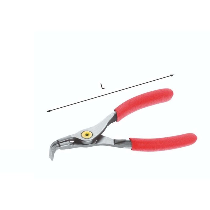 PINZE A BECCHI PIEGATI A 90° PER ANELLI ELASTICI ESTERNI - USAG 128PN UNI 7915 DIN 5254 Modello di precisione Punte in acciaio armonico inserite nei becchi: durata superiore rispetto alle punte tornite Superficie di appoggio degli anelli tra le punte ed i becchi Molla integrata nel corpo della pinza Manici rivestiti in PVC antiscivolo Esecuzione verniciata trasparente Codice Capacità mm L mm Q.tà x conf. U01280025 40÷100 220 5