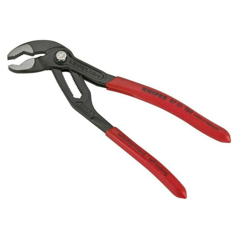 KNIPEX - 87 01 180 Pinza Cobra 180 mm Pinza per uso generico Cobra Knipex. Struttura con giunto a scatola. Ganasce autobloccanti da applicare a condotti e dadi, funzionano con la semplice pressione verso il basso di una mano. Il design registrato a ganasce parallele riesce ad effettuare la presa su forme esagonali sui quattro lati invece che due, evitando l'usura del dado. Impugnature in plastica. DIN5231D.