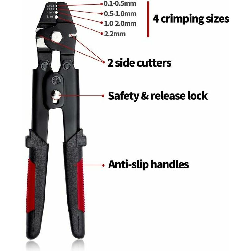 Confezione: 1 strumento di crimpatura per funi metalliche da 10 pollici Utilizzo: lo strumento di crimpatura ha 4 posizioni premute (intervallo di crimpatura 0,1-2,2 mm) e 2 comode posizioni di taglio. Ha anche la funzione di taglio. Lo strumento di crimpatura abbinato alla ghiera del corpo è adatto per cavi metallici, rame e bottoni a pressione. Design: con maniglie antiscivolo e meccanismo di bloccaggio automatico. La testa della pinza rivestita in teflon resiste all'acqua, alle macchie e previene la ruggine. Materiale: il piegatore è realizzato in acciaio forgiato ad alto tenore di carbonio e trattato termicamente per resistenza e durata. I manicotti ad anello a crimpare sono realizzati in alluminio con una buona resistenza alla corrosione. Manici in TPR bicolore per una presa antiscivolo e confortevole. Colore: nero rosso Quantità: 1 pezzo