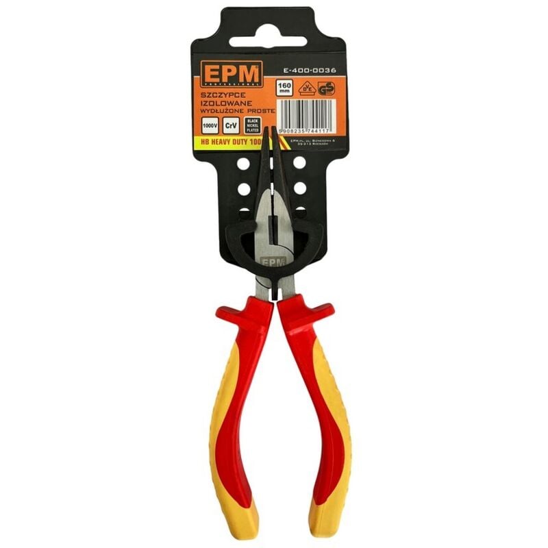 Dati tecnici Produttore: EPM Codice produttore: E-400-0036 Tipo: estesa dritta Misura [mm]: 160 Pinza isolata estesa dritta 160 mm In acciaio al cromo vanadio Progettata per lavori sotto tensione fino a 1000 V Materiale lucidato, impugnatura ergonomica HEAVY DUT - Serie Soddisfa i requisiti della norma DIN EN 60900 (VDE 0 682-201):2013-04 EN 60900:2012. Testato dall'istituto di prova e certificazione VDE**Le immagini sono solo a scopo illustrativo