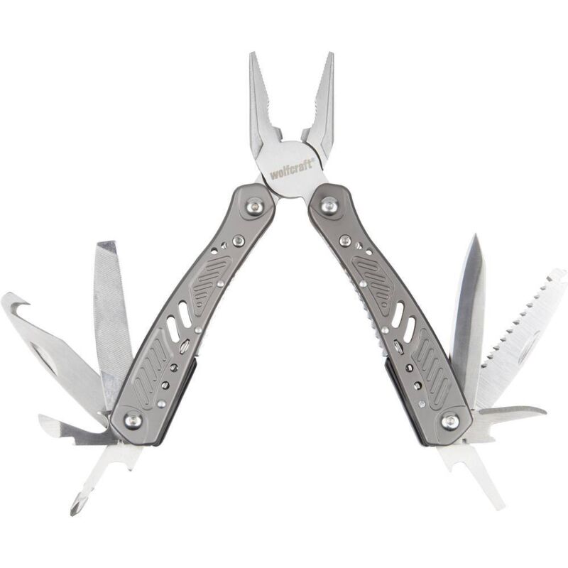 Pinza Multiuso 13 in 1 Wolfcraft 4080 Questa pinza multiuso è progettata per soddisfare le esigenze di chiunque abbia bisogno di uno strumento versatile per affrontare varie attività domestiche, lavori di bricolage o progetti più complessi. La pinza multiuso Wolfcraft 4080 è realizzata con materiali di alta qualità, garantendo resistenza e durata nel tempo. È dotata di una robusta struttura in acciaio inossidabile che offre una presa salda e confortevole durante l'utilizzo. La sua progettazione ergonomica assicura che sia facile da maneggiare, riducendo l'affaticamento delle mani anche durante le attività più impegnative. Con ben 13 funzioni integrate, questa pinza multiuso si adatta a molteplici compiti. Le sue principali caratteristiche includono una pinza regolare, una pinza per punte e una pinza per taglio, che permettono di afferrare e tagliare con precisione vari materiali come fili metallici, cavi elettrici e piccoli oggetti. Inoltre, questa pinza multiuso dispone di una lama