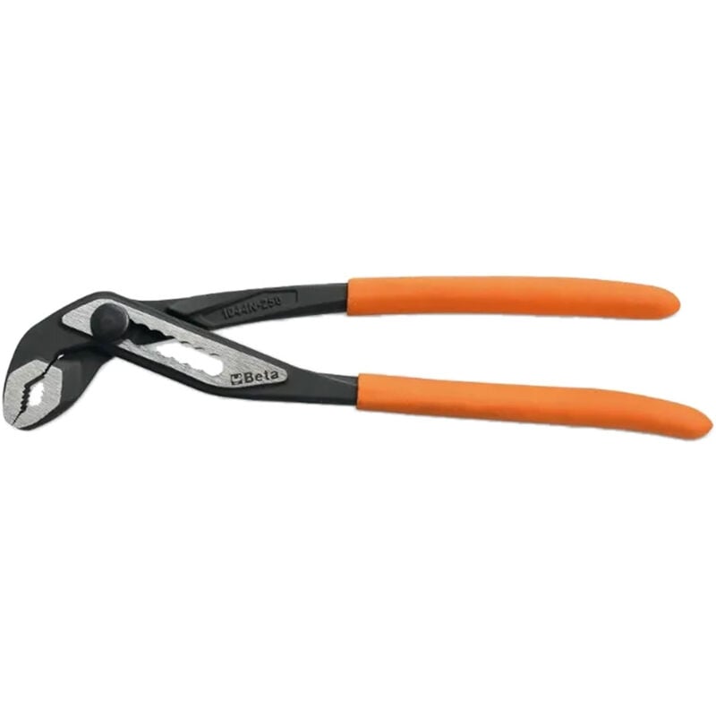 Pinza regolabile art. 1044n mm 250 - apertura max 46 mm Realizzata in acciaio al cromo-vanadio, finitura fosfatata. Chiodo cementato per garantire migliore resistenza all'usura, fermo di contrasto per evitare lo schiacciamento accidentale della mano, manici rivestiti in PVC antiscivolo per una presa sicura. Impugnatura a sezione triangolare per adattarsi perfettamente alla mano, riducendo lo sforzo e aumentando l'efficacia. Regolabile fino a 8 posizioni. Geometria dei denti studiata per una presa migliore di tubi ed esagoni. Conforme alla norma DIN ISO 8976. mm 250 - apertura max 46 mm Categoria dell'articolo: Utensileria beta - Pinze e tronchesi