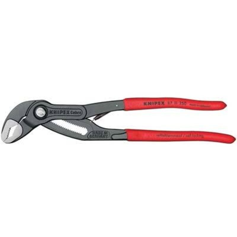 In acciaio al cromo vanadio, forgiato, temperato ad olio, bonderizzata grigia, testa pulita. Cerniera passante, con regolazione mediante pressione sul pulsante. Manici rivestiti in resina sintetica antiscivolo.
