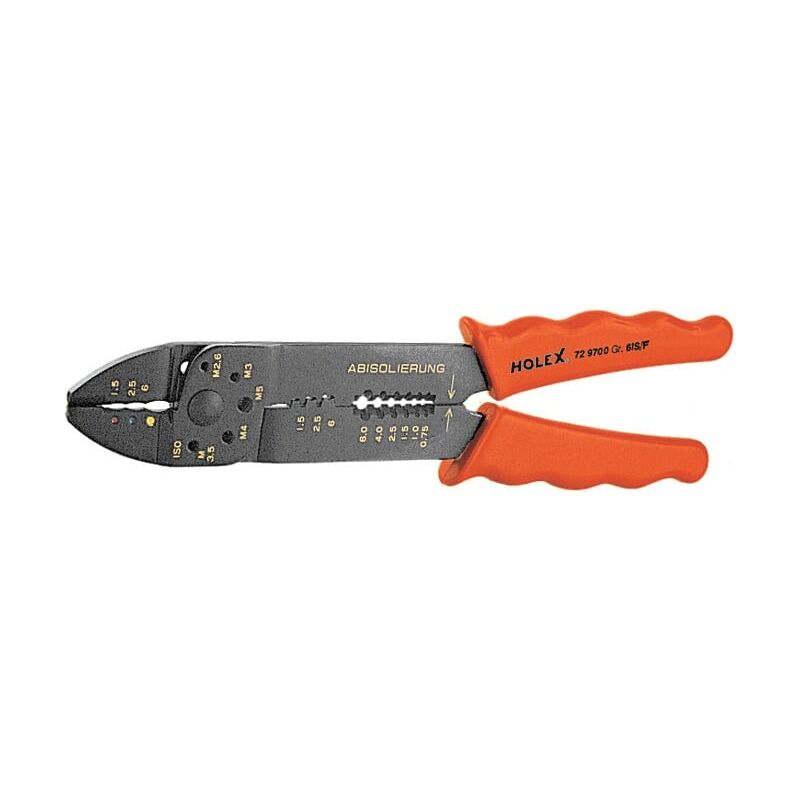 Corpo della pinza in acciaio con ganasce sagomate per serraggi diversi (vedi tabella). Tagliaviti da M2,6 − M5. Spellafili da 0,75 − 6 mm2. Pinza verniciata nera, becchi con manici rivestiti di plastica. Per spellatura, troncatura, serraggio, ecc., principalmente nel settore delle riparazioni. Dati tecnici Tipo di prodotto Pinza di serraggio Lunghezza complessiva, mm 220 Per sezione del filo, mm2 1,5 − 6