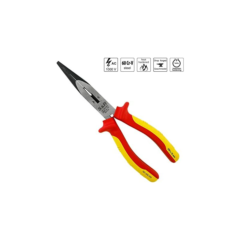 Pinza universale leggera con becchi piatti per installazione elettrica 210mm, ganasce 80mm, peso 224 gr. Realizzato in acciaio al cromo vanadio, trattamento superficiale fosfatato, rivestimento galvanico SICURO FINO A 1000V ➤ Il morsetto S&R ha isolamento VDE. VDE è la certificazione per elettricisti tedeschi. L'isolamento garantisce un funzionamento sicuro fino a 1.000 Volt. FILI DA TAGLIO FINO A Ø 3,0 mm ➤ Puoi tagliare fili di media durezza fino a Ø 3,0 mm e fili duri fino a Ø 2,1 mm < p > UTILIZZO VERSATILE ➤ Pinza da elettricista VDE per lavori di installazione elettrica per la presa e la piegatura di materiali piatti e tondi inferiori a 1000 V. Inoltre, lo strumento può essere utilizzato universalmente per lavori di artigianato e ingegneria PRESA PRECISA ED ERGONOMICA ➤ Manici bicomponenti ergonomici di alta qualità, isolati con manicotti multicomponente. Denti di precisione per una presa perfetta.