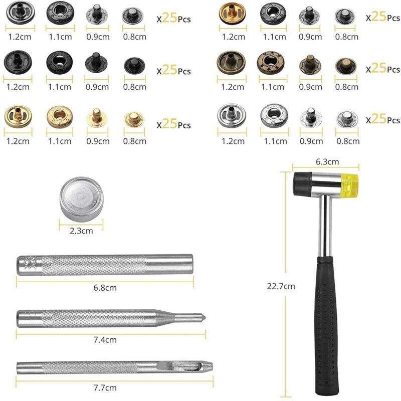 150 pinzette bottoni automatici Bottoni automatici senza cucitura Strumento per bottoni 6 colori 12,5 mm Descrizione: 150 set di bottoni automatici: i bottoni automatici sono perfetti per realizzare vestiti, oggetti artigianali e ornamenti cucendoli su camicie, giacche, tute, borse, ecc. schienali, scarpe, cappelli, cinture, vestiti e jeans imbottiti di cotone, pelle e così via. 100% nuovo e di alta qualità.: questo kit di attrezzi per bulloni la crimpatura contiene tutti i bulloni piegatrice, base di incastonatura, punzone cavo e utensili realizzati con metalli di alta qualità. e viene poi placcato in altri colori. Abbiamo anche preparato un martello per facilitare l'installazione dei bottoni a pressione. Sono durevoli e possono essere utilizzati a lungo. Dimensioni e colori: questo kit di bottoni a pressione. Ogni gruppo di pulsanti contiene 4 parti (2 cappucci, una vite e una presa) e la spina ha un diametro di circa 12,5 mm. E con oro, argento, bronzo, nero opaco, bronzo scuro