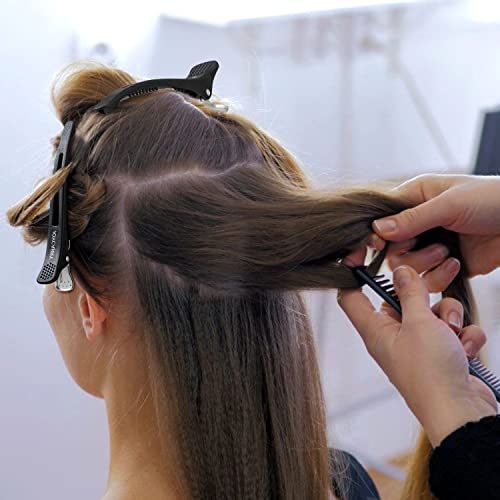 ❀【MATERIALE PREMIUM】 - La parte superiore del fermaglio per capelli è realizzata in plastica resistente, la parte inferiore è in metallo liscio e antiruggine, quindi scivola meglio nei capelli e non si impiglia nei denti come gli altri capelli clip. Ottimo anche per il taglio di aree di precisione. Il nastro in silicone ha una scanalatura antiscivolo molto importante per evitare che i fermagli per capelli cadano facilmente.