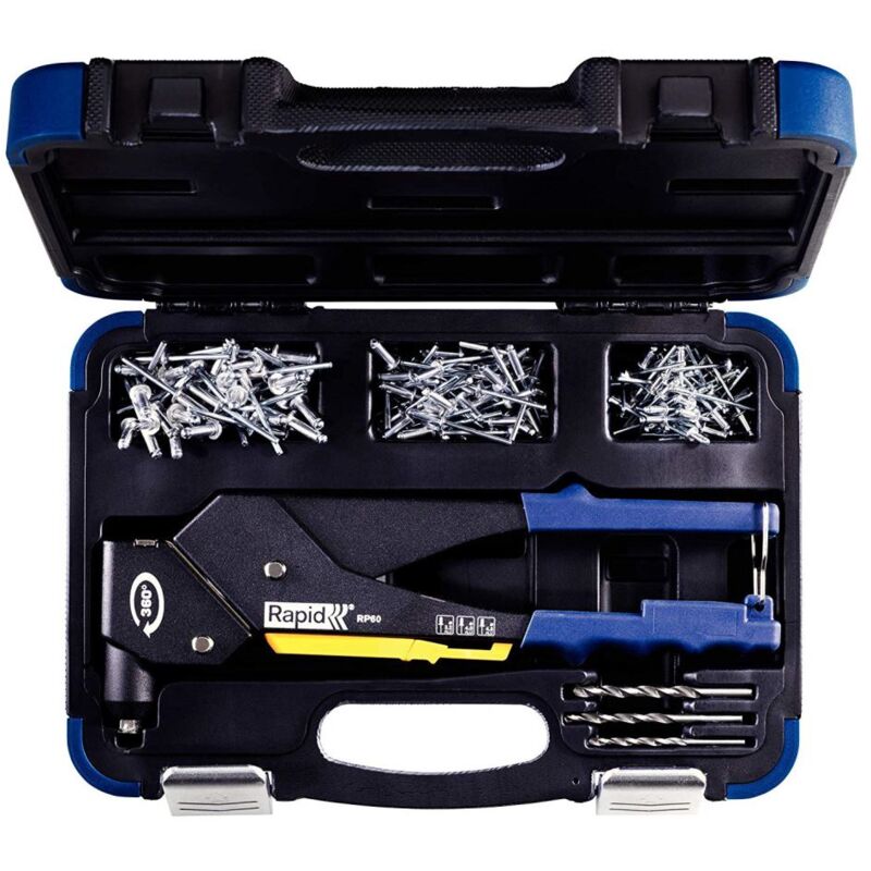 Rapid RP60 Multi Blind Tap con una valigia a testa girevole Aspetto l'efficienza di uno strumento di rivetto completo. Grazie al suo esclusivo bocchino universale, il rivetzange RP60 Multi può essere utilizzato senza cambiare il boccaglio. Inoltre, è dotato di una testa girevole a 360 °, che consente l'uso in aree strette e difficili da raggiungere. Queste funzionalità garantiscono meno interruzioni e risultati ottimali quando si lavora con qualsiasi tipo di piastre metalliche. L'RP60 ha strumenti di misurazione pratici per determinare il diametro del rivetto e lo spessore del materiale. Ora puoi essere sicuro di utilizzare il rivetto giusto nel buco giusto. Inoltre, la manopola softgrip a leva per il massimo comfort, parti metalliche indurite per una lunga durata del prodotto e una nobile superficie nera opaca. Per 3.2, 4.0 e 4.8mm rivetti di bocchino universale in alluminio, adatto per tutti i rivetti Sistema di prova semplice per determinare il diametro del rivetto Valvola di