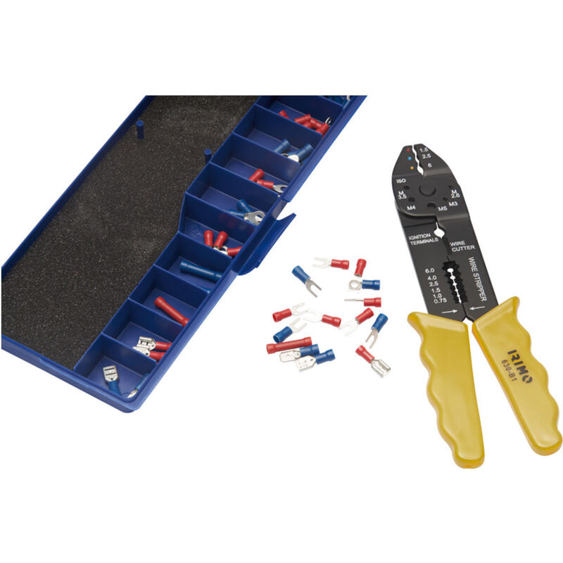 Set di pinze a crimpare con 60 terminali irimo 630-61b1-4. set di pinze a crimpare con terminali isolati. il set comprende le pinze a crimpare 630-b1-1 e 60 terminali isolati. adatto per operazioni di crimpatura/taglio/spelatura. crimpatura di terminali: 1,5/2,5/6mm2. taglio: m2,6-m5,0. spelatura: 0,75-6,0mm2. manici: plastica monomateriale gialla. finitura: placcata nera con trattamento anticorrosione. materiale: lamiera d'acciaio spessa con aree di lavoro temprate.