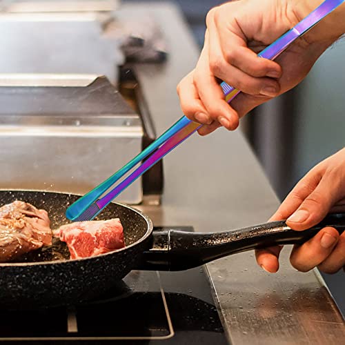 五点: 【Materiale di Alta Qualità】✅ Queste pinze da cucina in acciaio inossidabile color arcobaleno ottimo tutti coloro che apprezzano la cucina e si dilettano nel preparare pietanze varie ameranno queste pinze duttili.E hanno una buona resistenza alla ruggine e al calore.Sono durevoli e riutilizzabili,che possono avere una superficie liscia per evitare residui di cibo.