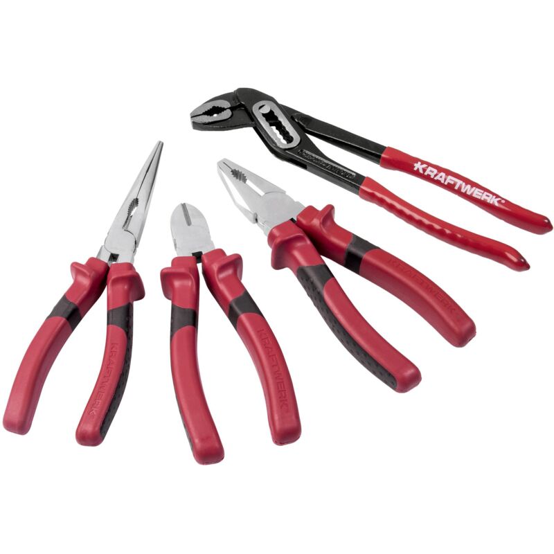 Kraftwerk 3292 Set di pinze Ergokraft professionali da 4 pz. Il set è composto dalle principali pinze, come ad es. pinza combinata, tronchese laterale, pinza per telefono (pinza a becco) dell'assortimento Ergokraft, nonché una pinza regolabile “idraulico” a cerniera chiusa. Il set di pinze professionali è composto dalle seguenti pinze: Kraftwerk 3281-180 Pinza combinata da 180 mm, Kraftwerk 3282-160 Tronchese laterale da 160 mm, Kraftwerk 3285-200 Pinza a becco 200 mm, Kraftwerk 2221-250 Pinza regolabile “idraulico” a cerniera chiusa da 250 mm.