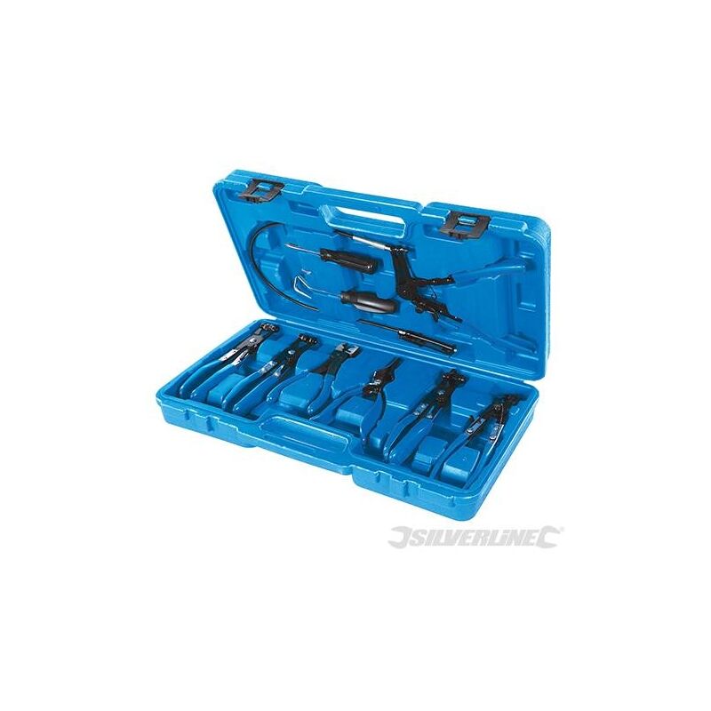 Pinza smontaggio fascette 18/54mm in posti di difficile accesso con bloccaggio della fascetta Pinza per fascette tipo + SLOT con cricchetto Pinza per fascette tipo V SLOT con cricchetto Pinza per fascette inclinata con piatti rotanti Pinza per fascette tipo VWagen con cricchetto Pinza per fscette riusabili CLIC e CLIC R Pinza per smontaggio tubi benzina e vuoti (da 5/32 a 1/2) LA CONFEZIONE COMPRENDE: 1 Set pinze 7pz e 1 Valigetta antiurto porta pinze