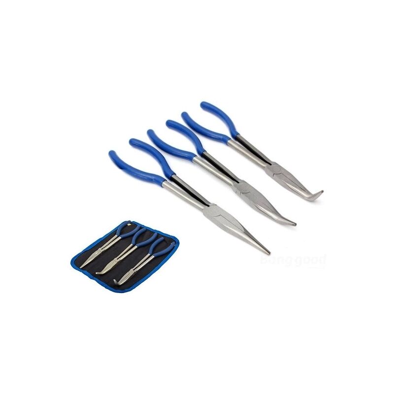 Set di pinze extra lunghe a punta seghettata con manico softgrip. Punte ad angolatura varia per essere utilizzate in qualisasi circostanza Materiali di alta qualit è Riposte in comoda custodia di tela.