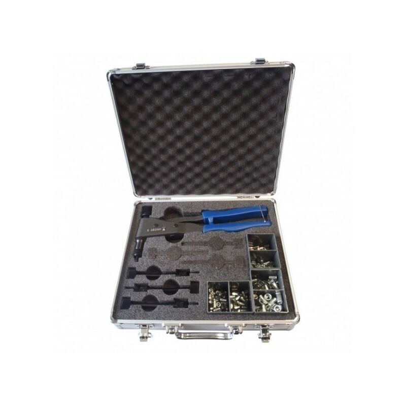 Dettagli: Pinze per dadi SCELL-IT: Pinze professionali piccole e maneggevoli per crimpare i dadi. Per cambiare i tiranti in modo facile e veloce, senza bisogno di attrezzi speciali. La lunghezza dei manici si adatta perfettamente alla forza necessaria per piegare dadi fino a M6. Capacità: M3-M6 - Alluminio - Acciaio - Acciaio inox Materiale del corpo: alluminio fuso. Materiale dell'impugnatura: plastica ABS Lunghezza: 280 mm. Peso: 0,8 kg Caratteristiche: nipplo di installazione M3 - M6. Fornito in una valigetta di alluminio per impieghi gravosi che include: Morsetto E-360NH Naso + tiranti M3, M4, M5, M6 60 controdadi TCR in acciaio zincato con testa ridotta: 30 x M4 - 30 x M5 120 controdadi TCD a testa piatta in acciaio zincato: 30 x M3 - 30 x M4 - 30 x M5 - 30 x M6 Dotazione: Fornito in una valigetta di alluminio per impieghi gravosi che comprende: Morsetto E-360NH Naso + tiranti M3, M4, M5, M6 60 controdadi TCR in acciaio zincato con testa ridotta: 30 x M4 - 30 x M5 120