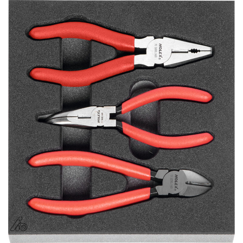 Esecuzione: Assortimenti standard di utensili in alloggiamenti in espanso rigido bicolore in PE. La struttura non porosa dell'espanso è impermeabile e resistente agli oli. Strato superiore color antracite, quello inferiore di contrasto color grigio mette in evidenza gli utensili mancanti. Fornitura: Inserto in espanso rigido vuoto n. art. 952001 Dim. 954165: 1 pz.Pinza universale in vanadio HOLEX n. art. 703000 Dim. 160: 1 pz.Pinza a becchi mezzotondi HOLEX piegata n. art. 713600 Dim. 160: 1 pz.Tronchese a tagliente laterale HOLEX n. 725250 Dim. 160: 1 pz. Riempimento di un cassetto in G: 8×8Larghezza: 200 mmProfondità: 200 mmLarghezza in G: 8Profondità in G: 8