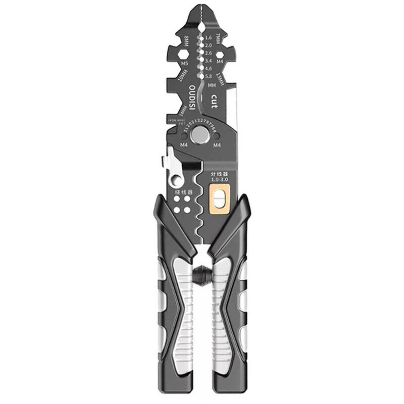 Questa pinza multiuso è realizzata in acciaio al cromo vanadio, con bordi duri per un taglio rapido, con elevata affilatura, resistenza all'usura e lunga durata. Pinze multifunzionali, con funzioni di spelatura, taglio, aggraffatura, separazione, avvolgimento e bloccaggio. Versatile e adatto a varie occasioni, adatto per la manutenzione dell'elettricista, la manutenzione della casa, la manutenzione degli elettrodomestici, la manutenzione della proprietà, ecc. Caratteristiche: Pinza multiuso, con funzioni di spelatura, taglio, aggraffatura, separazione, avvolgimento e bloccaggio. È realizzato in acciaio al cromo vanadio, con bordi duri per un taglio rapido, con elevata nitidezza, resistenza all'usura e lunga durata. Spelatura rapida del filo, può essere utilizzato per tagliare la copertura del filo, il legno e altri lavori, non il bordo ruvido, il taglio netto. Apertura precisa, fori di spelatura multi-spec, spelatura liscia e precisa, spelatura senza danneggiare il nucleo, con sei