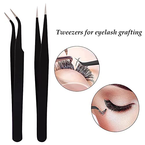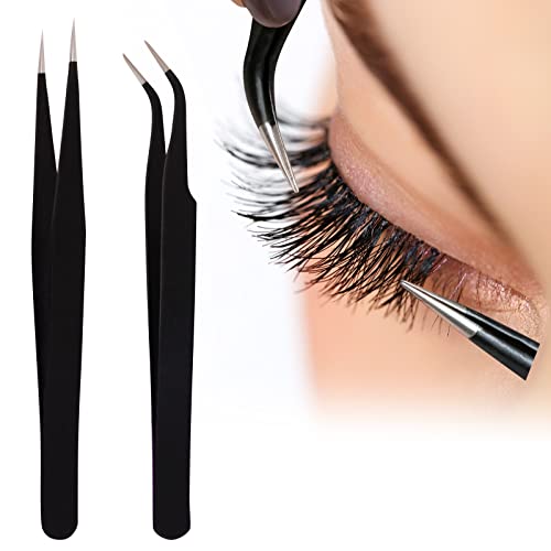 Pinzette per Extension Ciglia, Pinzette per Ciglia, Pinzette per Sopracciglia, 2 Pezzi Pinzette per Extension Ciglia in Acciaio Inossidabile Pinzette per Ciglia a Punta Dritta e Curva, Nero