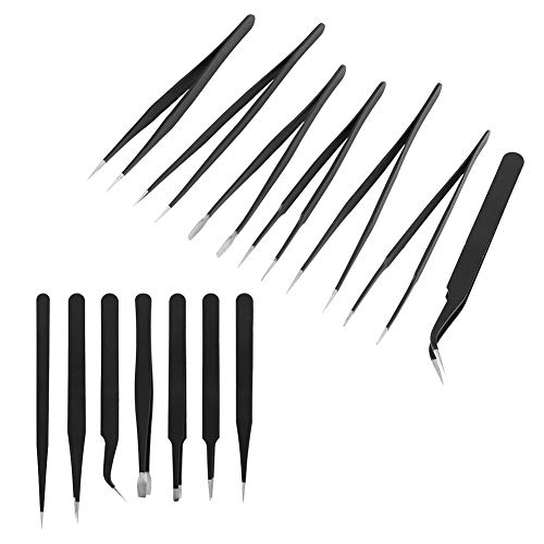 -Forgiato con acciaio inossidabile di alta qualità con forte durezza antiruggine e resistente all'usura. La superficie delle pinzette in acciaio inossidabile è rivestita di nerofumo conduttivo, che ha un effetto antistatico.