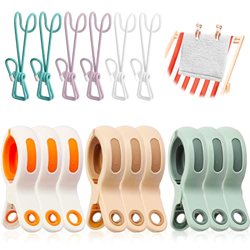 Pioli per asciugamani da spiaggia, 9 pezzi grandi clip per bucato in plastica antivento con 6 ganci per biancheria colorati e morbidi morsetti per asciugamano da spiaggia per lettino da sole