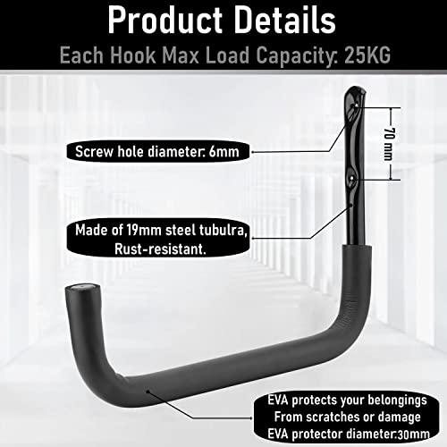 Materiali resistenti: il gancio portaoggetti per garage per kayak è realizzato in tubolare d'acciaio di alta qualità, con rivestimento antiruggine sulla superficie. Adatto per oggetti pesanti per uso interno ed esterno. Ogni gancio può contenere 25 kg.