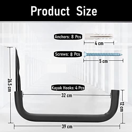 Confezione e dimensioni: 4 ganci per canoa da parete + 8 viti e 8 ancoraggi, dimensioni del gancio 39 cm x 26,5 cm (lunghezza x altezza). L'interno lungo 33 cm, è possibile utilizzarne due come abbinamento per appendere oggetti pesanti estremi.