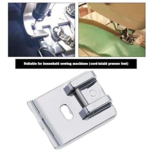 Funzione: questo piedino viene utilizzato per realizzare tubazioni e tubazioni da cucito. Il piedino ha due scanalature sul fondo per tenere il cavo intarsiato. La dimensione massima del cavo dell'intarsio è di 5 mm.