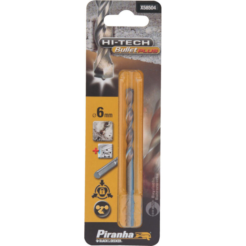 1 punta innovation piranha X58511 Per granito hi-tech bullet plus. 10 mm con codolo esagonale Punta in metallo duro (Hard Metal) realizzato con carburi metallici sinterizzati ad alte temperature. Adatta a forare cemento, marmo, mattoni, ma anche i materiali piu' duri come la pietra Piranha e' un marchio Black&Decker ed e' un linea di accessori professionali universali per tutte le applicazioni. Gli accessori sono adattabili a tutti gli utensili dei marchi leader nel settore dell'utensileria elettrica e manuale. Piranha e' un marchio basato sull'alta tecnologia. La gamma dei suoi accessori e' il risultato combinato di esperienza di fabbricazione, ricerca e sviluppo dettagliato in grado di rispondere alle esigenze del cliente finale, sia esso un professionista che un privato. In negozio abbiamo tutta la gamma di accessori Piranha. Per informazioni e preventivi gratuiti non esitare a contattarci.