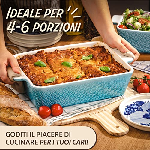 IDEALE PER 4-6 PERSONE: Pirofila rettangolare in ceramica blu | Dimensioni: 28 cm x 22 cm x 8 cm | Peso: 2 kg | Con pratiche maniglie.