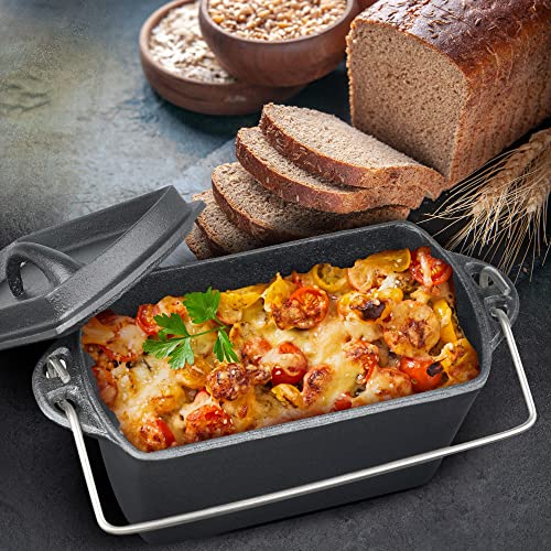 PRATICO: pirofila in ghisa pretrattata e pronta all'uso | dotata di pratica maniglia per il trasporto e coperchio | Teglia dalla forma ideale per torte, pane o sformati